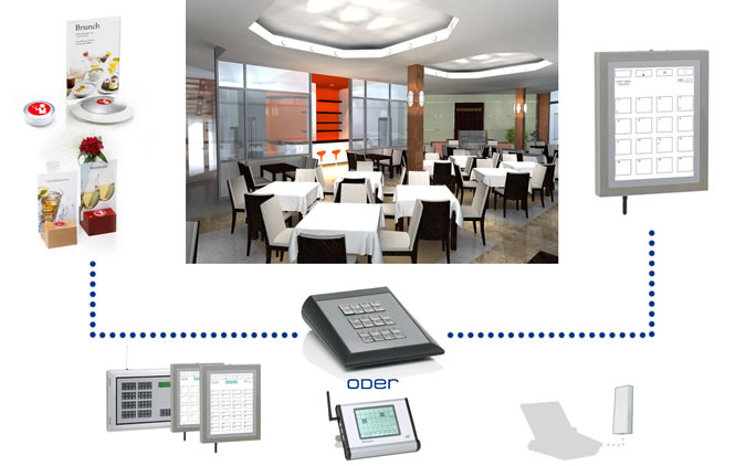 Funk-Rufe von den Tischen und aus der Küche werden an Tableaus oder Kassenrechnern angezeigt.