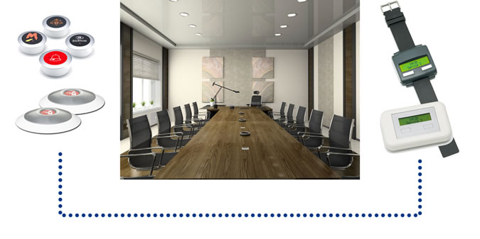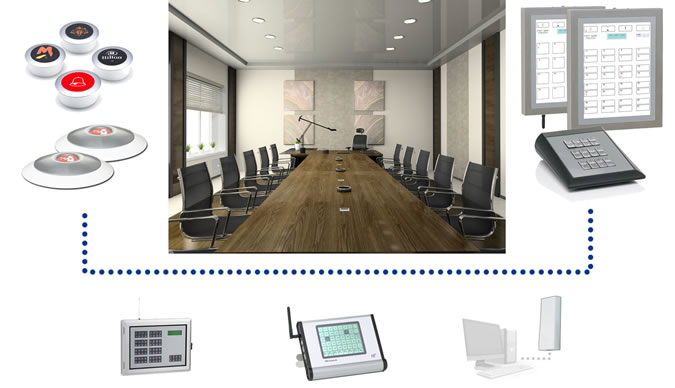 In Vorstandsbüros und Besprechungsräumen wird auf Knopfdruck ein Ruf nach Assistenz - z.B. zur Sekretärin bzw. Messehostess – ausgelöst.